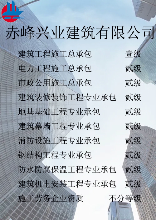 赤峰興業(yè)建筑有限公司簡(jiǎn)介 赤峰興業(yè)建筑有限公司成立于1998年7月,位于內(nèi)蒙古赤峰市松山區(qū)?,F(xiàn)已發(fā)展成為擁有建筑工程施工總承包壹級(jí)、電力工程施工總承包貳級(jí)、市政公用工程施工總承包貳級(jí)、承裝、修、試四級(jí)、?建筑裝修裝飾工程專(zhuān)業(yè)承包貳級(jí)、建筑幕墻工程專(zhuān)業(yè)承包貳級(jí)、消防設(shè)施工程專(zhuān)業(yè)承包貳級(jí)、地基基礎(chǔ)工程專(zhuān)業(yè)承包貳級(jí)、鋼結(jié)構(gòu)工程專(zhuān)業(yè)承包貳級(jí)、建筑機(jī)電工程專(zhuān)業(yè)承包二級(jí)、防水防腐保溫工程專(zhuān)業(yè)承包貳級(jí)以及建筑施工勞務(wù)等資質(zhì)的綜合性建筑施工企...